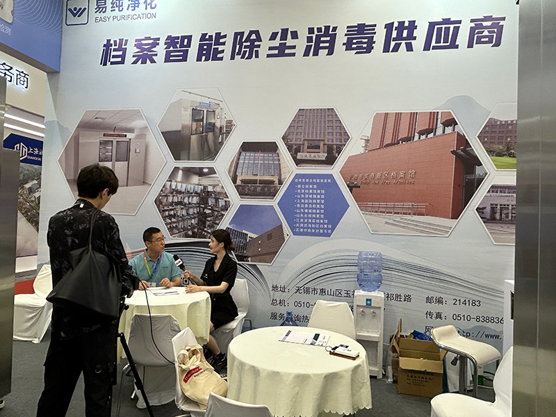 易純凈化連續兩年參加智慧檔案展覽會展出,現場展出的檔案除塵室,檔案除塵柜,自動感應門風淋室,檔案消毒室受到了廣大檔案行業人員的高度認可和興趣,在現場大家熱情參觀,討論行業趨勢,設備改進以及未來檔案行業除塵消毒的新技術、新趨勢,共同展望未來。在檔案展會期間公司領導層接受了CCTV央視媒體采訪,充分認可公司在檔案除塵設備行業的發展及付出,也祝愿公司在未來可以取得更加良好的發展。